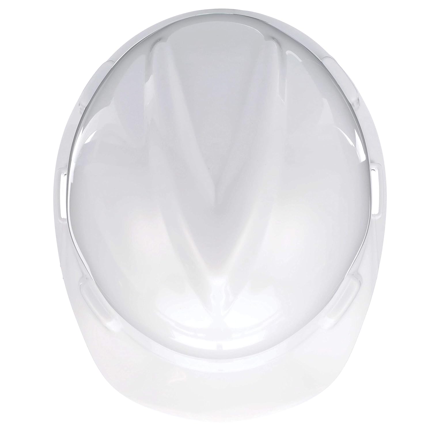 Premium hard hat provides comfortable protection. Polyethylene shell with ratchet suspension ensures excellent shock absorption while keeping weight down. Self-adjusting crown straps simplify sizing.