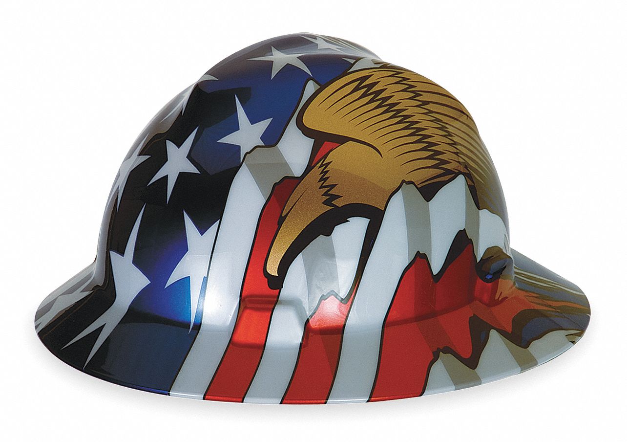 Introducing the MSA V-Guard Full Brim style hard hat with American Eagle & Stars and Stripes Flag Design. Hard hat wearers can express their patriotism and protect their heads by wearing our special series of MSA Freedom hats. This design features an American Eagle with USA flag around the entire surface of the full brim hard hat. Complies with ANSI Z89.1, 2014, Type 1 Class C, E, and G Standards