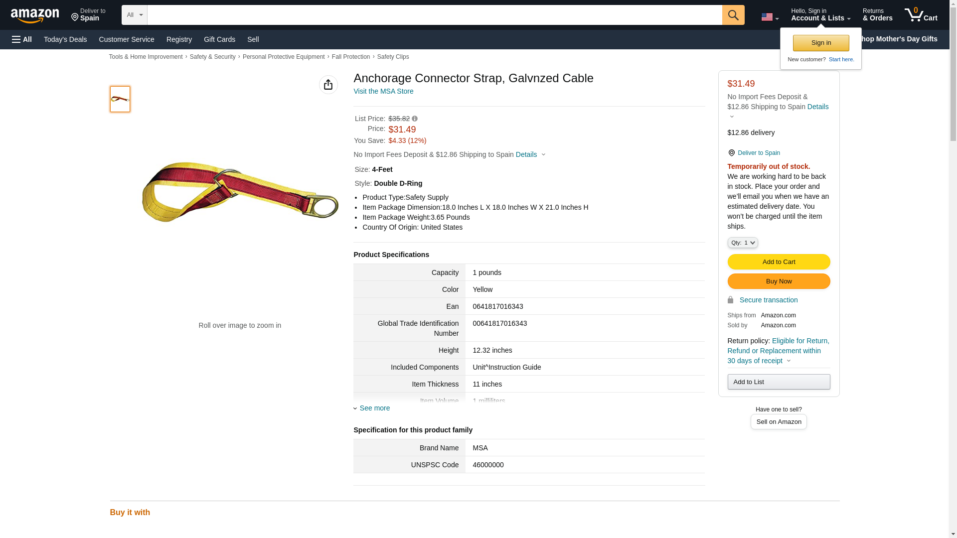 MSA Safety SFP2267504 Anchorage Connector Strap with Galvanized Cable