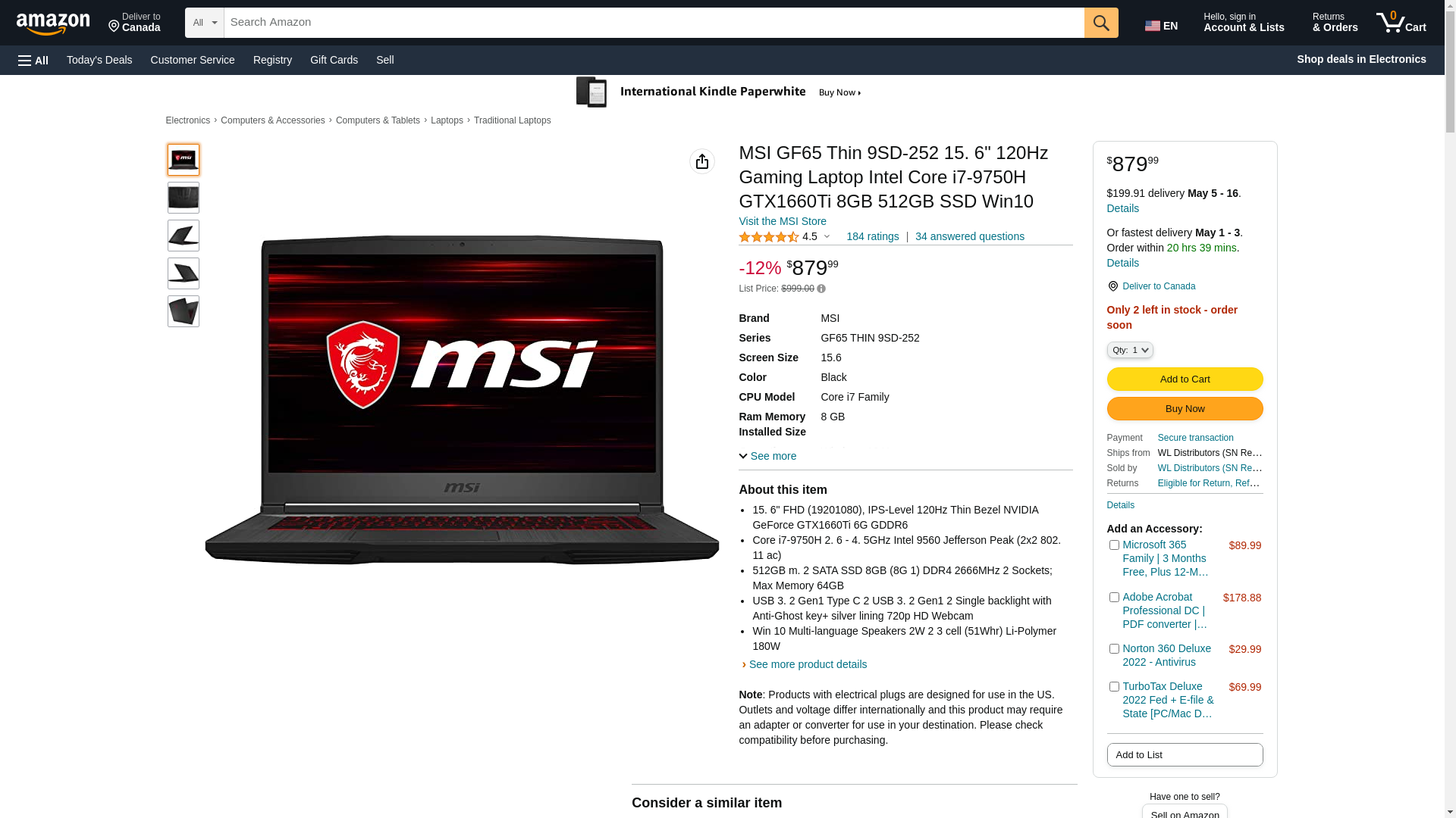 MSI GF65 Thin 9SD GF65 THIN 9SD-252 15.6 Inch Gaming Notebook - 1920 x 1080 - Core i7 i7-9750H - 8 GB RAM - 512 GB SSD - Black