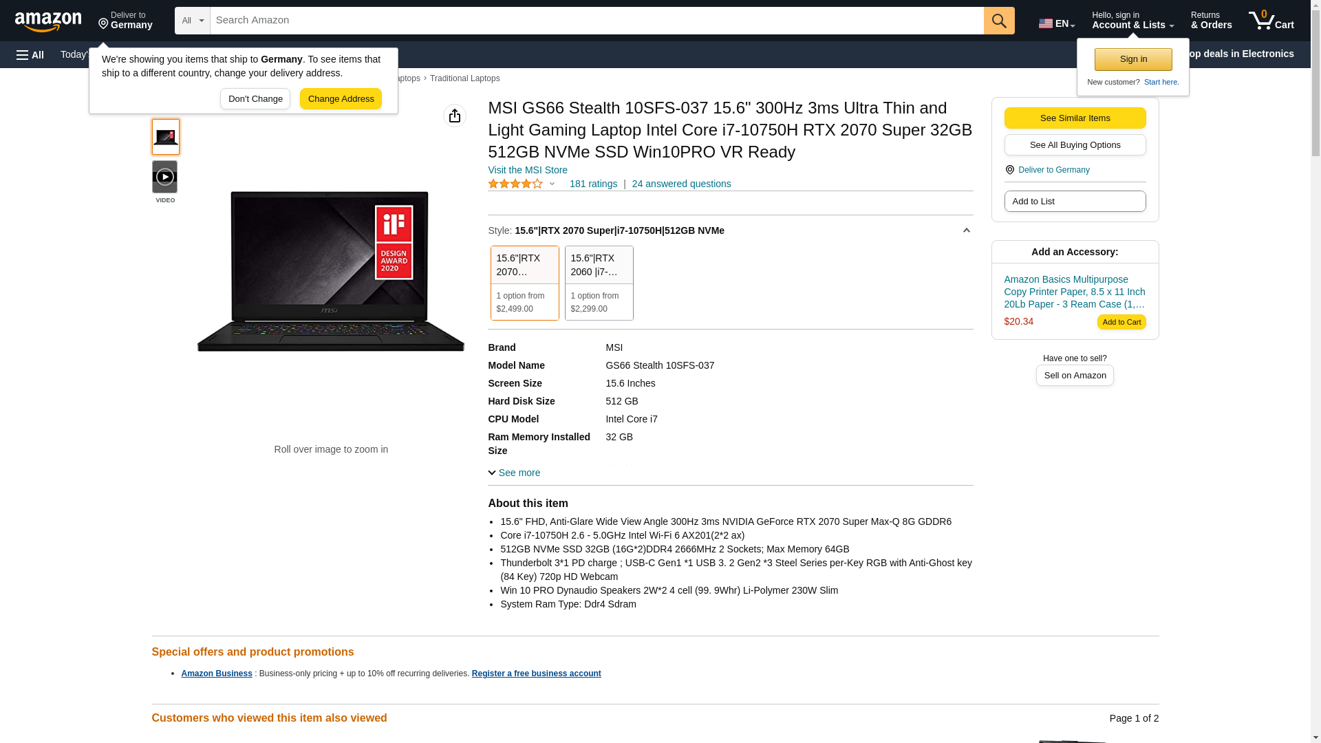 MSI GS66 Stealth 10SFS-037 15.6" 300Hz 3ms Ultra Thin and Light Gaming Laptop Intel Core i7-10750H RTX 2070 Super 32GB 512GB NVMe SSD Win10PRO VR Ready