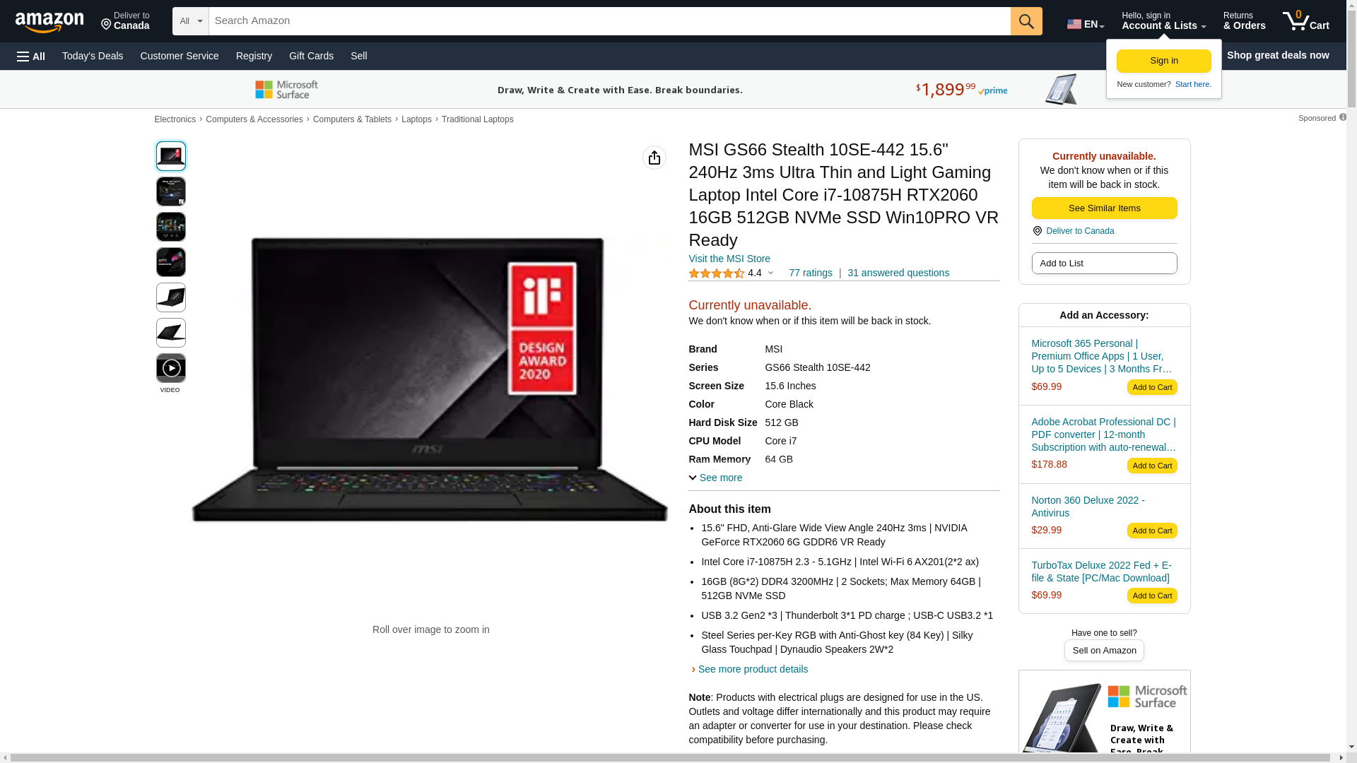 <strong></strong><br><br><strong> MSI GS66 Stealth 10SE-442 GS66442 Black Color Gaming and Entertainment Laptop-Gaming</strong><br><br><li>Series MSI GS66 Stealth 10SE-442</li><li>Form/Style Standard; Black</li><li>Model No: GS66442</li><li>10th Gen Intel Core i7-10875H 2.3GHz Processor (upto 5.1GHz, 16MB Cache, 8-Cores)</li><li>NVIDIA RTX 2060 6GB GDDR6 Graphics, VR Ready</li><li>15.6" Full HD (1920x1080) 240Hz Refresh Rate Display, </li><li>802.11ax Wifi, Bluetooth 5.1, 720p HD Webcam, Per Key RGB Backlit Keyboard, </li><li>1 HDMI, Thunderbolt3 (Type-C), USB 3.2 Type-C Gen2, Headphone/Microphone Combo Jack</li><li>180W Power Supply, 4-Cell 99 WHr Battery</li><li>Product Dimensions (WxLxH): 14.17 IN x 9.65 IN x 0.71 IN</li><li>Weight - 4.63lb</li><li></li><br><br><b>Microsoft 365 Personal 1 Year Subscription for 1 User</b><br><li>Model: QQ2-01024</li><li>Model Number: MC365</li><li>12-Month Subscription | Office apps | 1TB OneDrive</li>