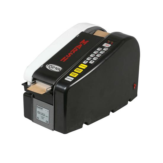 TD2100 Electric Taper, 110 V Premium Long (Inch) The state-of the-art, electronically driven, TD2100 Electric tape dispenser was designed with ease of operation and dependability in mind. Has a tactile keypad with repeat keys for short and long tape lengths. Ideal for sealing same size cartons! Random/Continuous feature built in, LCD display of programmed lengths. Features: 10 pre-set lengths up to 90" "Apex" design guillotine style cutter. Made of 420HC Stainless Steel. Long life and requiring very little cleaning and adjustment. 70 oz water bottle increases production "Up Time" with fewer refills. Largest bottle in the industry! Tactile keypad with LCD display of lengths. 12 gauge, all metal chassis construction, powder coated industrial gray. A rubber valve reduces water spillage. Wide track 1.5" feed roll and pinch roll using a high coefficient of friction urethane to ensure accurate and quiet tape feed through. Built-in all metal adjustable tape channel guides. All metal construction, easy to adjust with built-in thumbscrew feature for centering tape roll. "Open Basket" design allows for easy viewing of remaining tape roll and easy drop-in reloading. Accommodates up to 1000 foot (305 meter) tape roll (max roll diameter is 9" (222.6mm). Certified to CE and to UL 60950; CSA C22.2.