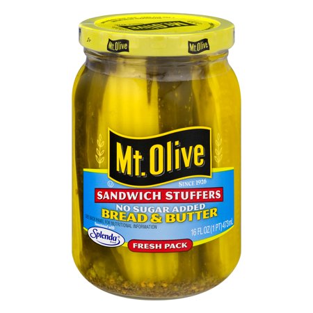 <ul> <li>Mt. Olive Sandwich Stuffers, No Sugar Added Bread & Butter.</li> <li>Since 1926.</li> <li>See back panel for nutritional information.</li> <li>Sweetened with Splenda brand.</li> <li>Fresh pack.</li> <li>16 fl oz (1 pt) 473 ml.</li> </ul>