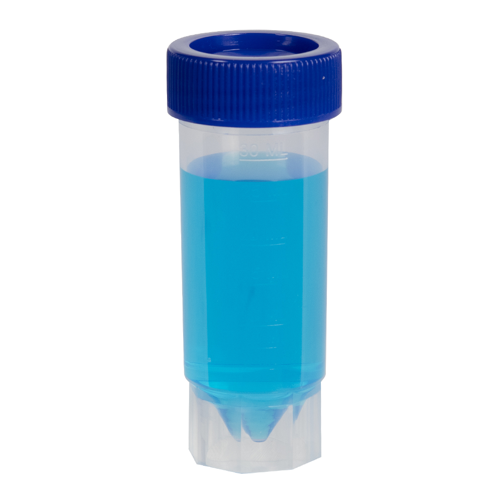 30mL Sterile Clear Polypropylene Self-Standing Centrifuge Tube with Blue Screw Cap & Molded Graduations - Case of 500
