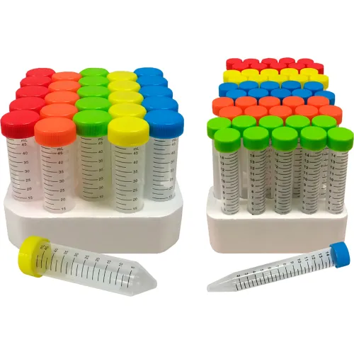 MTC Bio’s SpectraTube is a new twist on a staple in the life science laboratory. We’ve taken the proven design of the 15 and 50mL conical tube and configured them conveniently in a foam rack with five different colored caps to make sample identification a breeze. These tubes are perfect for any lab conducting multiple studies, or any e x periments requiring multiple sample types or solutions. All five cap varieties are flat, brightly colored, and frosted to make them easy to write on. Don’t let the pretty colors fool you. These conical 15mL and 50mL centrifuge tubes are made of premium polypropylene, with e x ceptionally uniform wall thickness for clarity and centrifugal strength. Tubes and caps may be used for sample storage at temperatures as low as -45°C. The ma x imum centrifugal forces are 12, 000 x g for the 15mL tubes and 15, 000 x g for 50mL version.* Tubes and caps are suitable for stem cell research and certified sterile, RNase, DNase, and Pyrogen free. *Refers to liquids with a specific gravity of 1.0, using appropriate rotors, cushions and adapters. Centrifuge Tubes with Rainbow Caps, 15mL, PP, Sterile, 50/foam rack This listing is for Pack of 500
