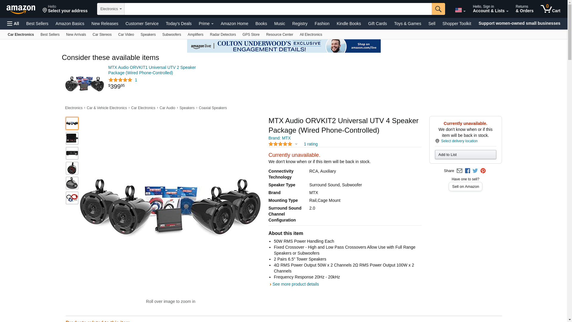 Powerful, Four-Speaker MTX Extreme Sports Sound System The ORVKIT2 is a package that includes everything you need to take your UTV, boat, bike, or whatever to the next level in sound. This kit includes the all new MTX MUD100.2 which is the most compact amplifier that MTX has ever made. The unit includes 2 channels that are capable of delivering 100 watts of RMS power per channel, perfect power for driving the included marine tower speakers in parallel. The Four MUD65P MTX Marine Tower Speakers can project amazing sound to get you rocking big time. The included reducer kit allows you to connect them to roll cages as small as 1.5". Phone-Controlled Motorsports Sound Package - 2 Speaker Compact amplifier and speakers that can be installed on any boat, UTV, sand rail, or motorcycle with mounting access to the bar (handle bar, roll bar, frame bar, wake board bar, etc).Compact And Powerful The MTX MUD100.2 is the most compact amplifier that MTX has ever made. This unit features full range class D topology that delivers exceptional sound quality and excellent thermal efficiency. The unit includes 2 channels that are capable of delivering 100 watts of RMS power per channel. More than enough power to drive a single or dual full range speakers per channel.True Marine Speakers With Great MTX Sound Unlike other marine product that is just a white version of car stuff, Thunder Marine is designed for the harshest marine environment. The MUD65P is a 6.5" coaxial speaker with HDPE enclosure capable of delivering up to 50 watts RMS power and designed to mount to the tower or roll cage of boats and UTV's. These speakers are designed to withstand the elements. They polypropylene woofer and dome tweeter are weather resistant. The HDPE enclosure is highly durable and includes a UV inhibitor that will prevent it from fading over time. The grilles feature ASA construction making them nearly unbreakable.