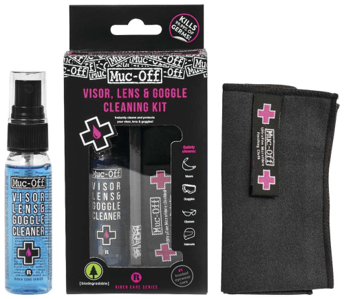 The ideal kit for keeping in your pack for quick and safe cleaning on the go. <br>Each Visor, Lens and Goggle Cleaner Kit <br>Contains a premium quality microfiber cloth that's designed <br>To clean delicate finishes and a 32ml spray bottle of pH balanced <br>Biodegradable cleaning formula.
