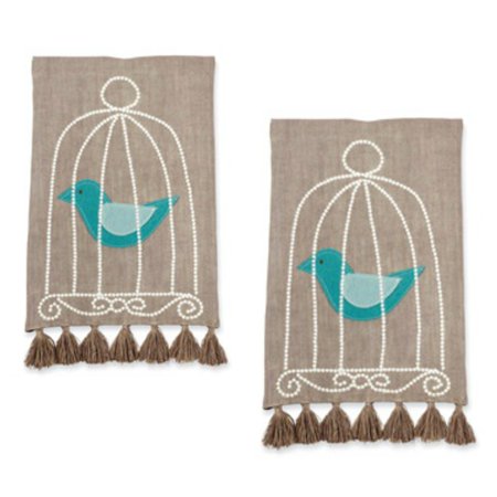 Appliqued Teal Blue Bird in Cage Linen Guest Towels Set of 2 Mud Pie