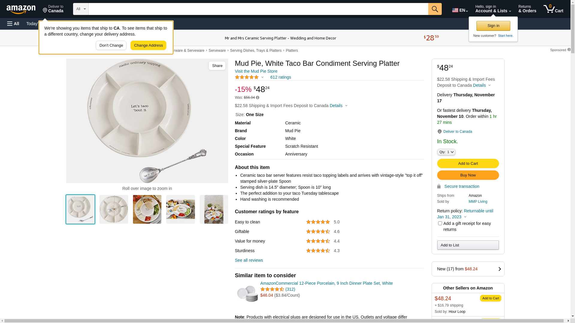 Mud Pie, White Taco Bar Condiment Serving Platter