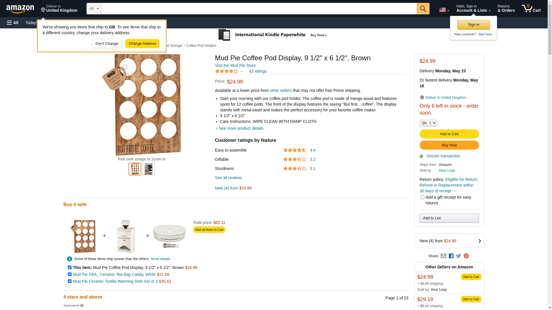 - Start your morning with our coffee pod holder. The coffee pod is made of mango wood and features spots for 12 coffee pods. The front of the display features the saying "But first…coffee". The display stands with metal easel and makes the perfect accessory for your favorite coffee maker.