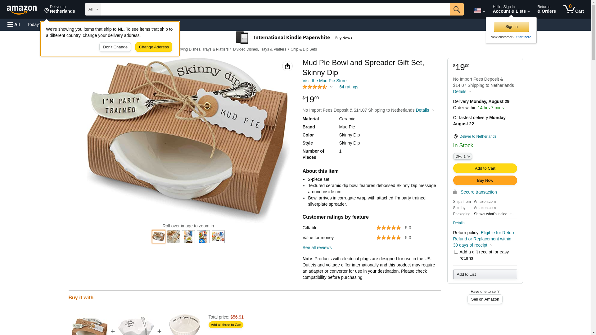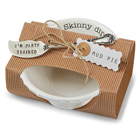 Textured ceramic dip bowl from Mud Pie feature debossed "Skinny Dip" message around the inside rim. Bowl arrives in a corrugate wrap with attached "I'm Party Trained" silver-plate spreader. <br /> <br />
