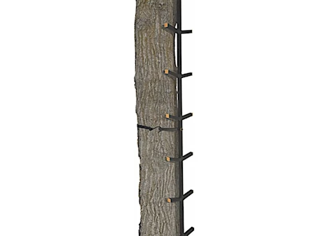 - 𝐀𝐋𝐋 𝐒𝐓𝐄𝐄𝐋 𝐂𝐎𝐍𝐒𝐓𝐑𝐔𝐂𝐓𝐈𝐎𝐍 - Built with design in mind, these all steel welded sticks are held secure to the tree with five one-inch Cam-Buckle straps, while the five sleeved sections with large alternating angled steps help you easily climb the 20' to your stand in no time