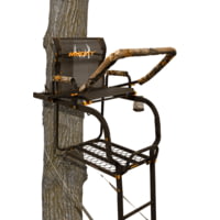 - QUIET, PADDED SHOOTING REST AND ARMRESTS - This durable steel ladder tree hunting stand is equipped with extra thick one-inch padded armrests and a one-inch padded adjustable shooting rail with the ability to be flipped back for an open shooting lane