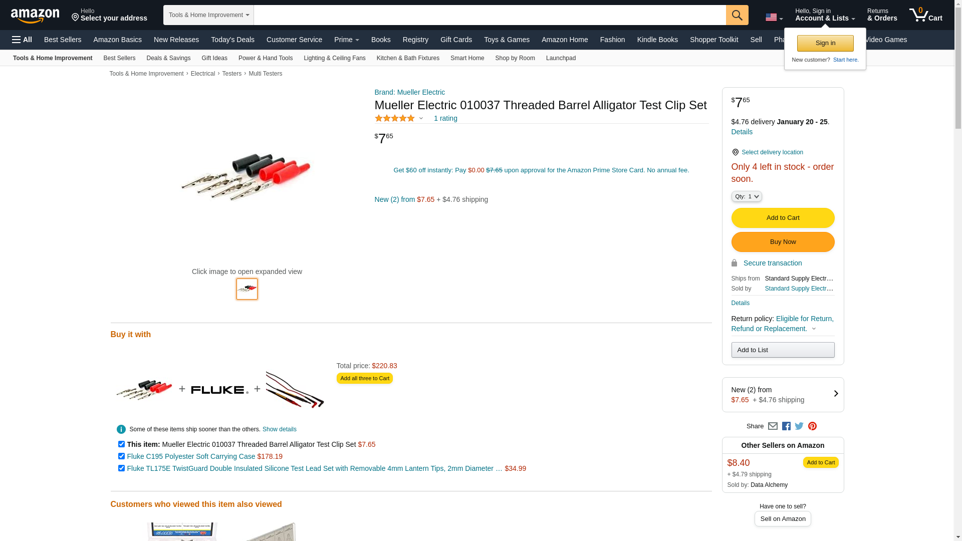 Mueller Electric 010037 Threaded Barrel Alligator Test Clip Set. Set includes 4 x BU-60TBO alligator clips, 2 x BU-62-0 black insulators, 2 x BU-62-2 red insulators in retail packaging. Compatible with 8-32 threaded test leads.