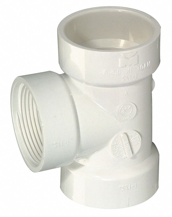- Price For: Each Max. Temp.: 140 Degrees F Basic Fitting Shape: Tee Fitting Schedule/Class: Schedule DWV Basic Fitting Material: Plastic Color: White Fittings Sub-Category: Tees Pipe Fitting Material: PVC Standards: ASTM D2665, F1498, D3311 & D3965, NSF International Listing Fitting Connection Type: FNPT x Hub x Hub Fitting Length: 2.25" Pipe Size (Fittings): 1-1/2"