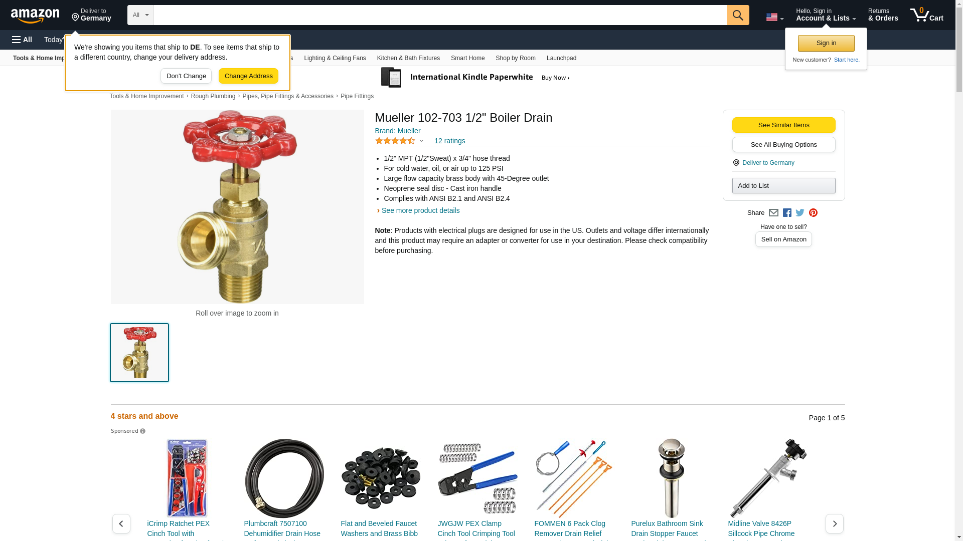 Sold as 4 UNITS at $6.58 per unit. (1 unit = each.) For cold water, oil, or air up to 125 PSI. Large flow capacity brass body with. 45 degree outlet. Neoprene seal disc. Cast iron handle. Complies with ANSI B2.1 and ANSI B2.4. Data tag. 1/2" MPT (1/2"Sweat) x 3/4" Hose Thread . Manufacturer number: 102-703. SKU #: 4029625. Country of origin: China. Distributed by Mueller Industries.