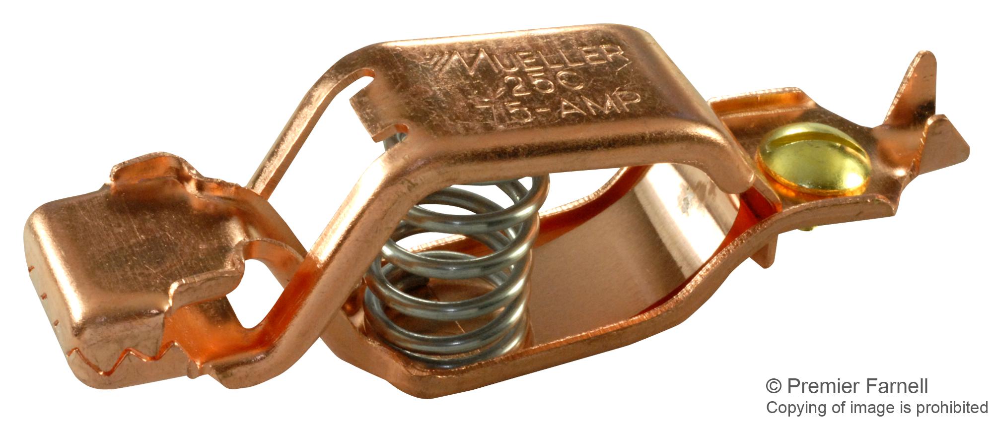 Mueller BU-25C 3/4" 40 Amp Copper Clip Teeth Mesh on all Three jaw Sides For a Wide Range of Automotive and Electrical Test Applications Crimp or Screw Connection Jaw Opens 3/4" Max Federal Spec: Type PC-4 5/PK