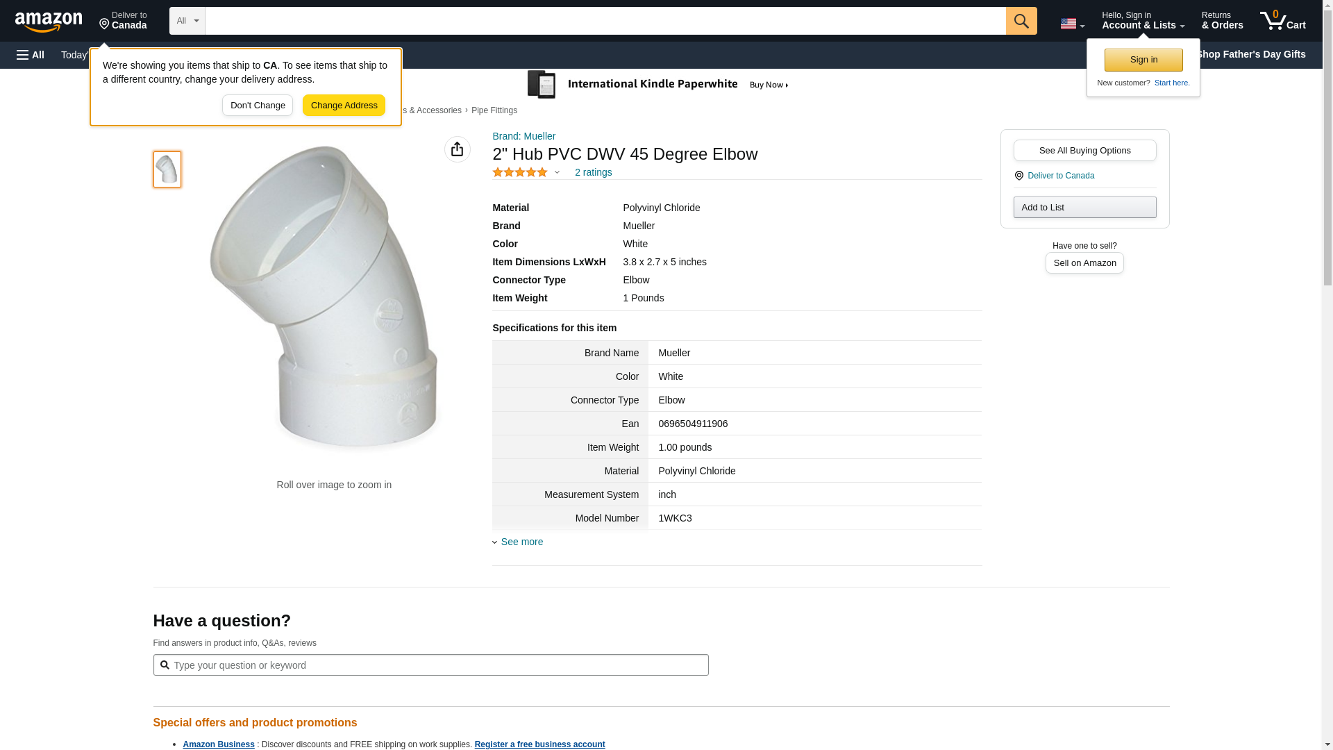 - Price For: Each Standards: Cell Class 12454, ASTM D1784 Max. Temp.: 140 Degrees F Body Material: PVC Color: White Fittings Sub-Category: Elbows Schedule: DWV Connection Type: Hub Pipe Size: 2" Item: Elbow, 45 Degrees Country of Origin (subject to change): United States