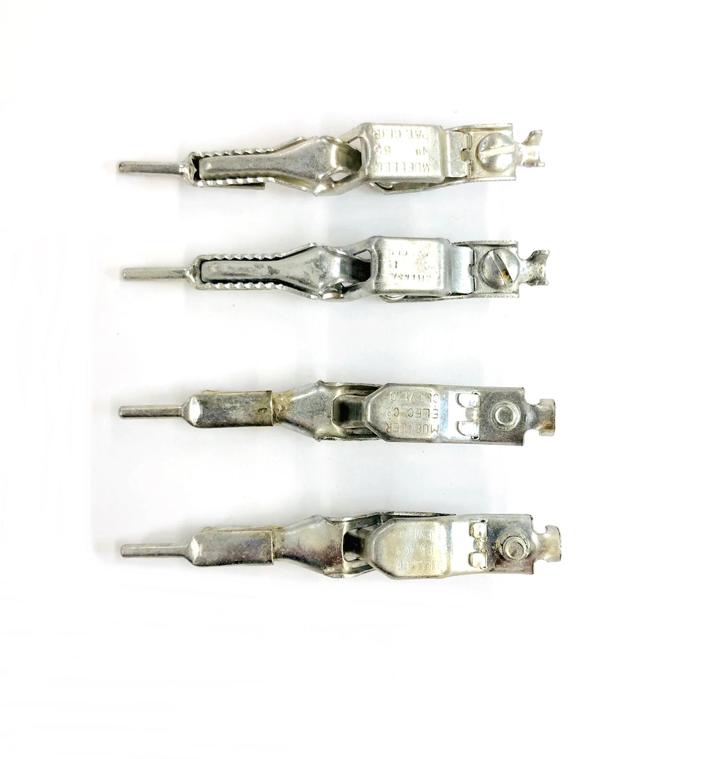 Lot of 4 Mueller BU-85T, 5 Amp Steel Crocodile Clips w/Pin Tip 010027- – MarVac Electronics