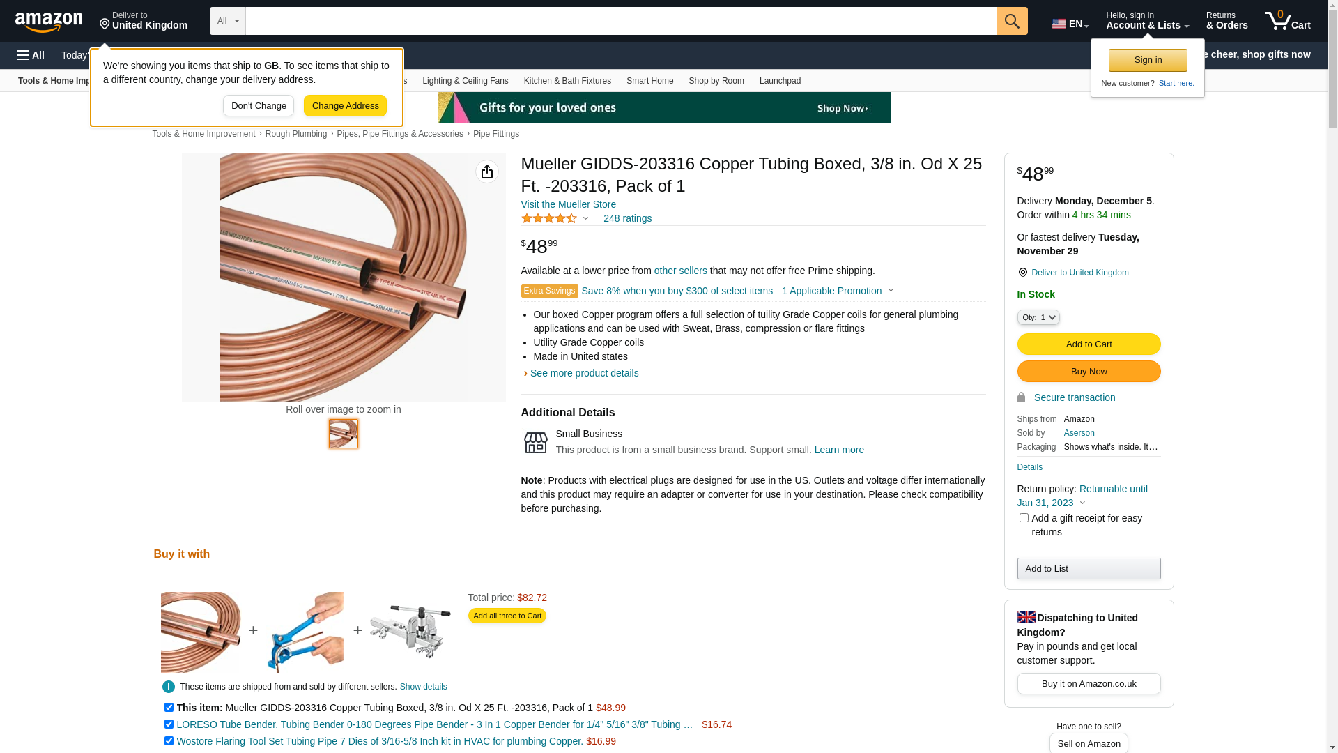 MUELLER INDUSTRIES GIDDS-203316 Copper Tubing Boxed, 3/8" Od x 25\