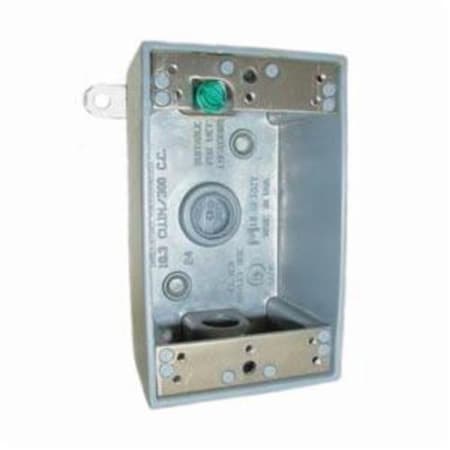 Part Number: 095327305877 <br> Part: Mulberry Metal 30587 2.625" Deep, 1-Gang, Royal Mountie Box <br> 1-Gang, Weatherproof Box, Die Cast. Depth: 2-5/8". (4) 3/4" Threaded Outlets (2 in one end, 1 in other end, 1 in back), Cubic Inches: 24.0". Includes: (2) Closure Plugs & Ground Screw. Color: Gray. <br> Gangs:1 <br> Material:Die Cast <br> Type:Outlet Box <br> Product Depth:2 5/8 in <br> Cubic Inches:24 in <br> Knockouts:3/4 in, 4-KO <br> Also known as: 095327305877, MUL30587, Mulberry Metal, 30587, 1-Gang Boxes - Metallic, Metallic Boxes & Covers, Boxes - Weatherproof, Boxes, Enclosures <br> Equivalent to: <ul></ul>