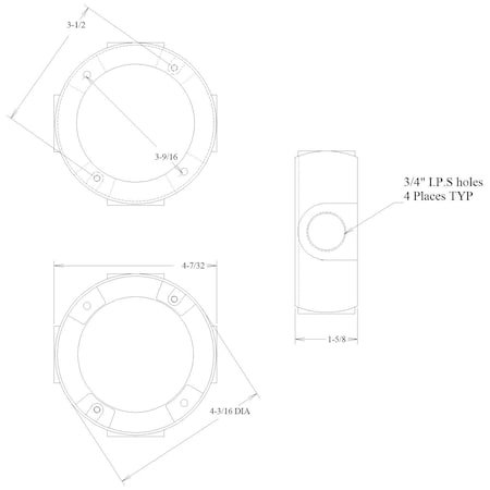 Part Number: 095327303354 <br> Part: Mulberry Metal 30335 1-1/2" Deep, 4" Diameter, Weatherproof Box Extension <br> 4" Round, Weatherproof Box Extension, Die Cast. Depth: 1-1/2". (4) 3/4" Threaded Outlets, Cubic Inches: 15.3". Includes: (4) Closure Plugs, Mounting Screws & Ground Screw. Color: Gray. <br> Diameter:4 in <br> Material:Die Cast <br> Type:Round, Extension <br> Product Depth:1 1/2 in <br> Cubic Inches:15.300 in <br> Knockouts:4-KO, 3/4 in <br> Also known as: 095327303354, MUL30335, Mulberry Metal, 30335, Round Extensions - Metallic, Metallic Boxes & Covers, Boxes - Weatherproof, Boxes, Enclosures <br> Equivalent to: <ul></ul>