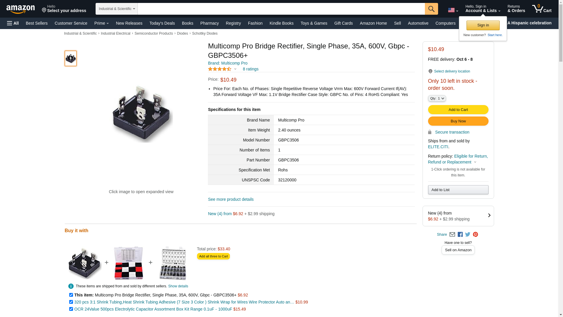 - Price For: Each No. of Phases: Single Repetitive Reverse Voltage Vrrm Max: 600V Forward Current If(AV): 35A Forward Voltage VF Max: 1.1V Bridge Rectifier Case Style: GBPC No. of Pins: 4 RoHS Compliant: Yes