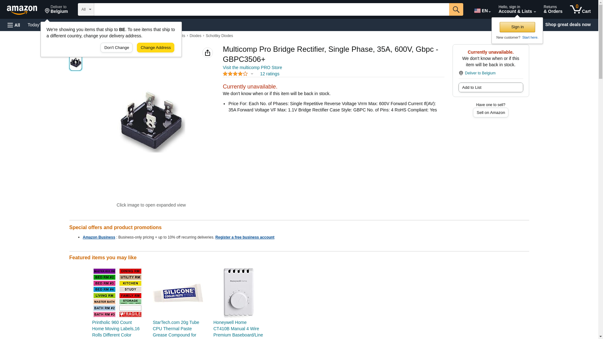 | Feature | Price For: Each No. of Phases: Single Repetitive Reverse Voltage Vrrm Max: 600V Forward Current If(AV): 35A Forward Voltage VF Max: 1.1V Bridge Rectifier Case Style: GBPC No. of Pins: 4 RoHS Compliant: Yes |