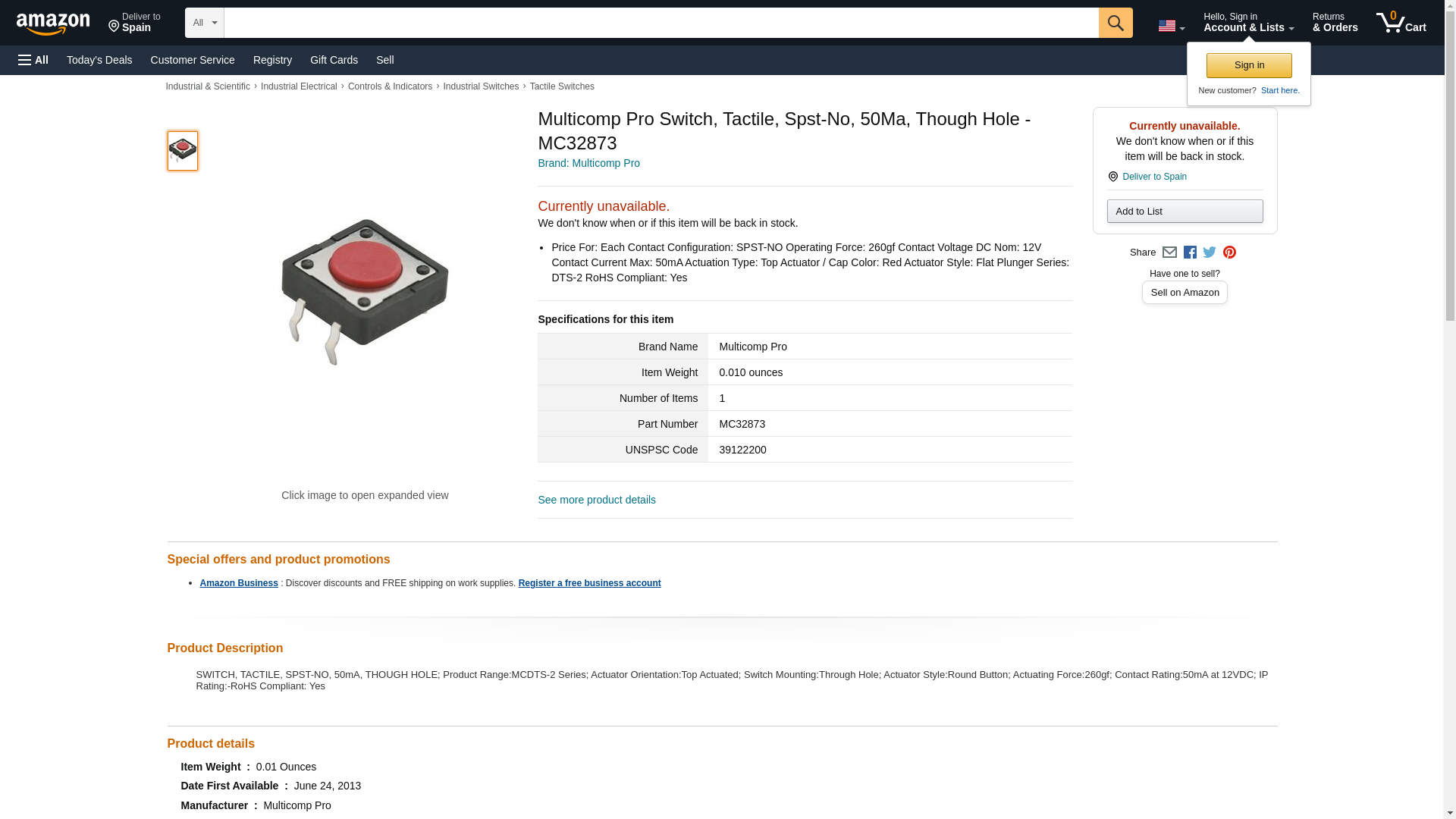 | Feature | Price For: Each Contact Configuration: SPST-NO Operating Force: 260gf Contact Voltage DC Nom: 12V Contact Current Max: 50mA Actuation Type: Top Actuator / Cap Color: Red Actuator Style: Flat Plunger Series: DTS-2 RoHS Compliant: Yes |