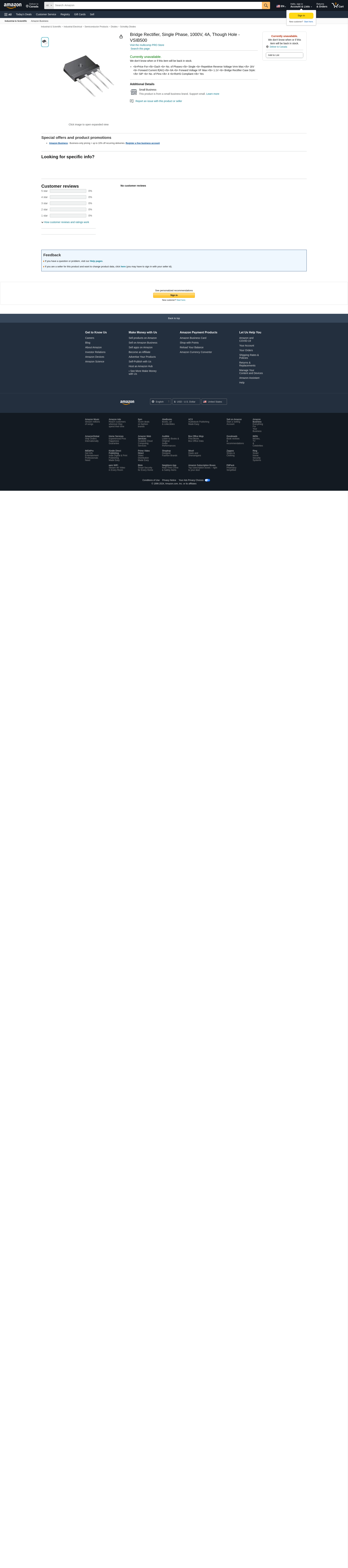 - <b>Price For:</b> Each <b> No. of Phases:</b> Single <b> Repetitive Reverse Voltage Vrrm Max:</b> 1kV <b> Forward Current If(AV):</b> 6A <b> Forward Voltage VF Max:</b> 1.1V <b> Bridge Rectifier Case Style:</b> SIP <b> No. of Pins:</b> 4 <b>RoHS Compliant:</b> Yes