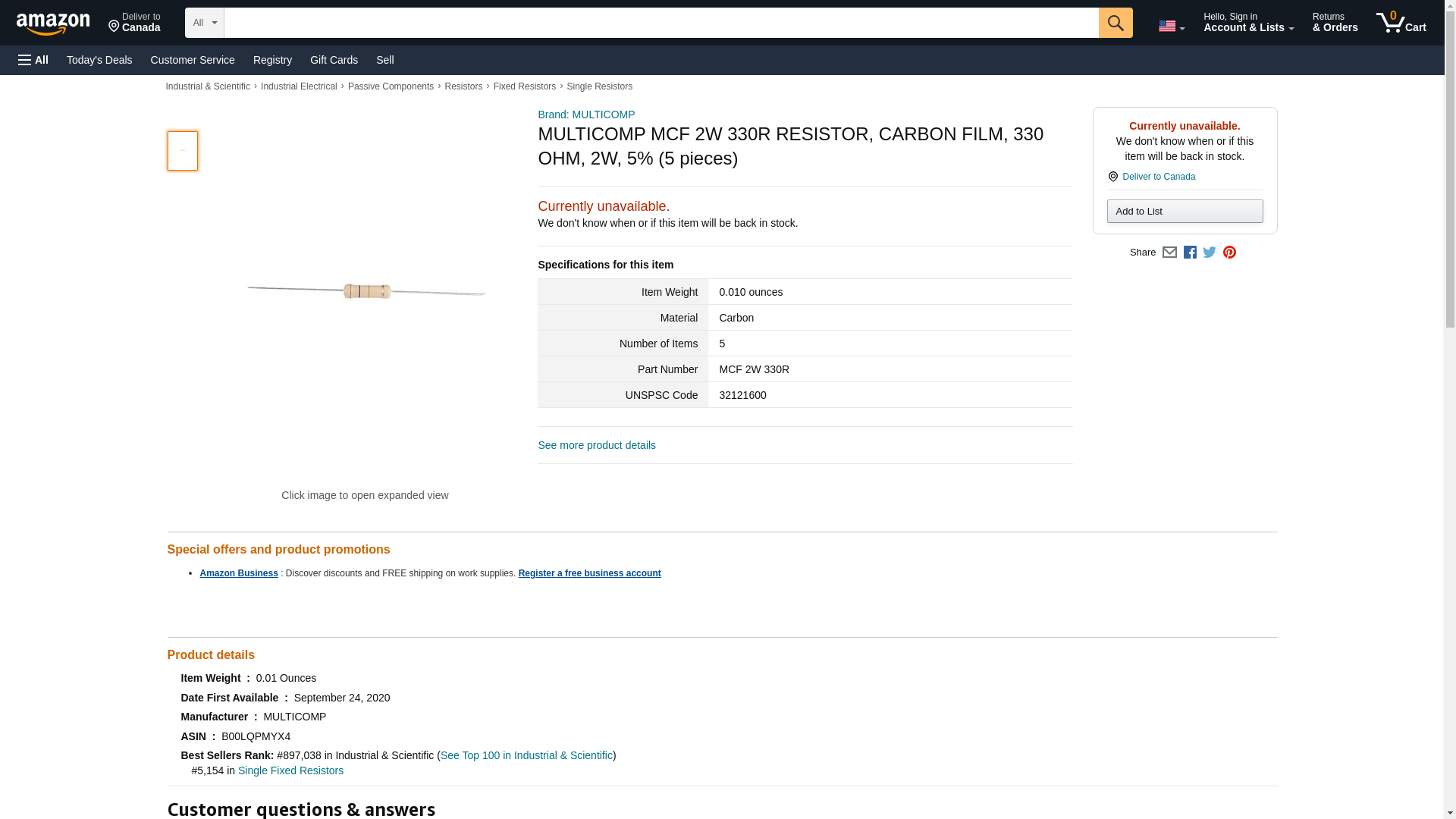 MULTICOMP MCF 2W 330R RESISTOR, CARBON FILM, 330 OHM, 2W, 5% (500 pieces)