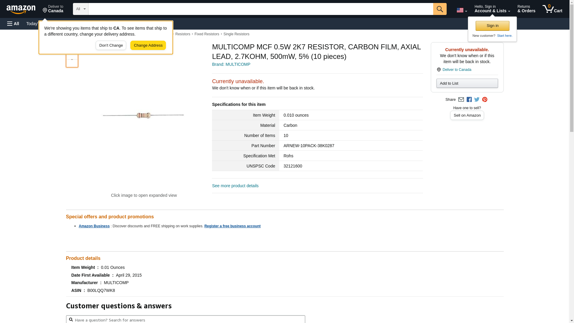 MULTICOMP - MCF 0.5W 2K7 - RESISTOR; CARBON FILM; AXIAL LEAD; 2.7KOHM; 500mW; 5%