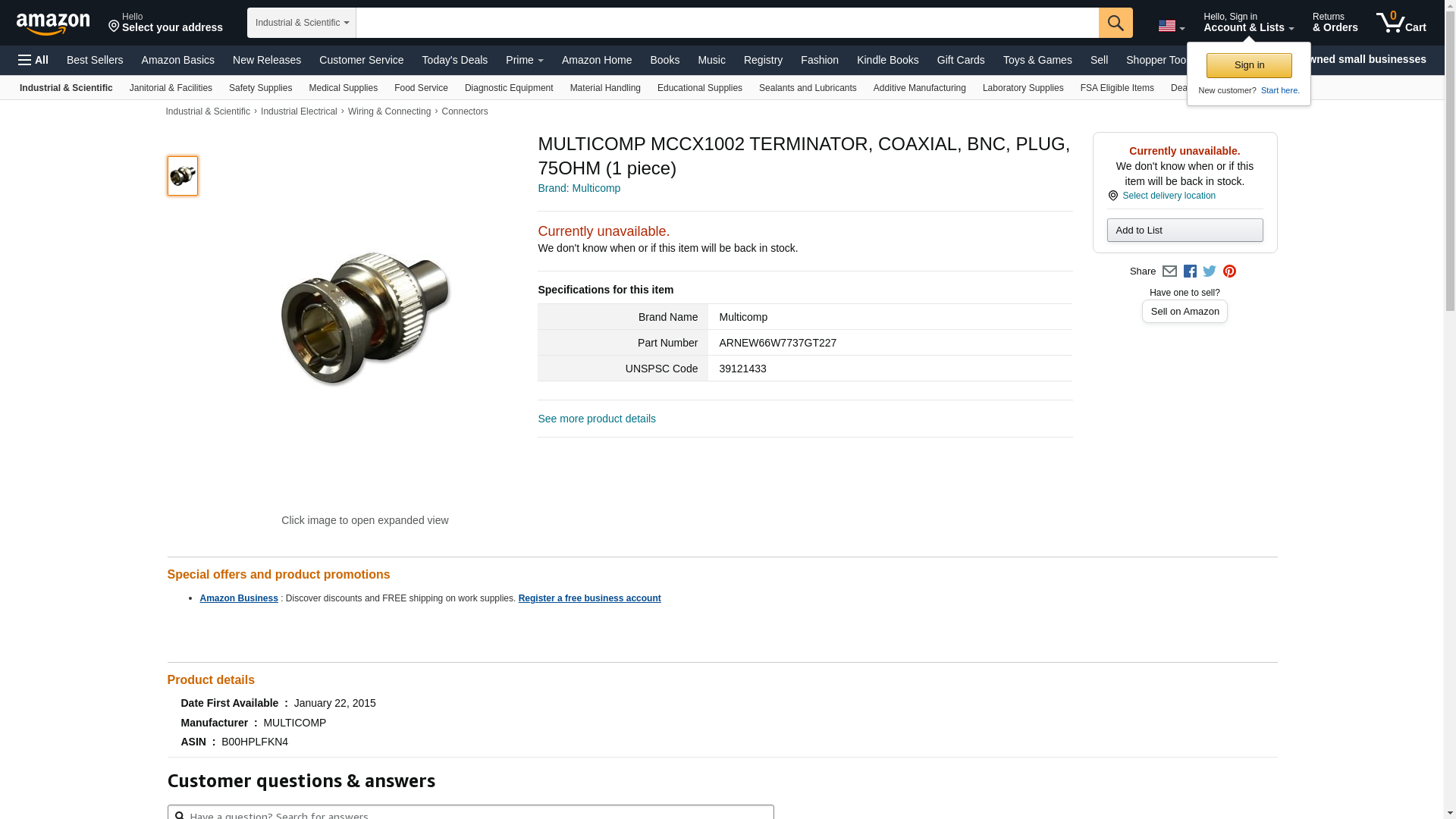 MULTICOMP MCCX1002 TERMINATOR, COAXIAL, BNC, PLUG, 75OHM (500 pieces)