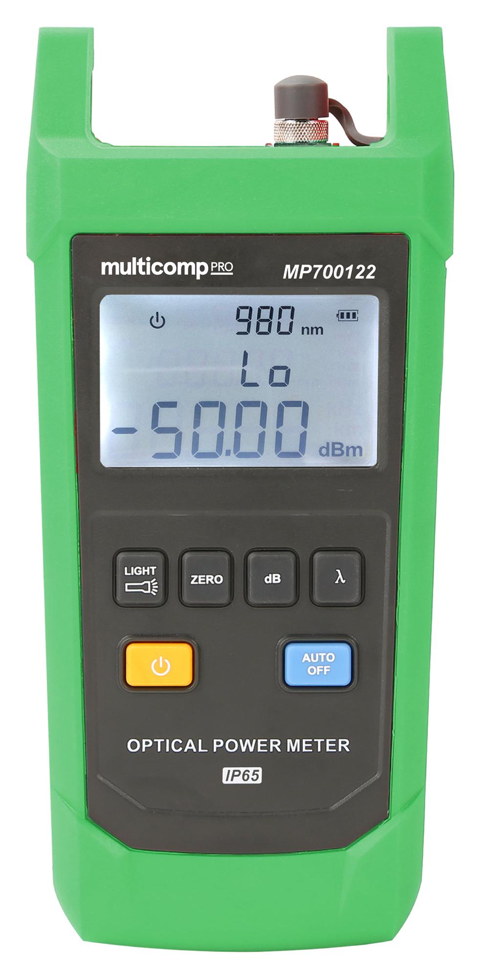 The MP700122 from Multicomp Pro is a handheld optical power meter, used to measure absolute optical power or relative loss of optical power through length of fibre optic wires. This product is designed to be durable, the meter can withstand a 2m drop and has a dust/water resistance rating of IP65. Other features include backlight display, flashlight, auto power-off, wavelength store/recall, user calibration and ultra-wide optical power test range. Used in applications such as cable construction and maintenance, optical fibre communication, evaluation of optical equipment, production, installation, operation and maintenance of fibre optic transmission systems, and optical engineering, laboratory, production plant or facility maintenance.