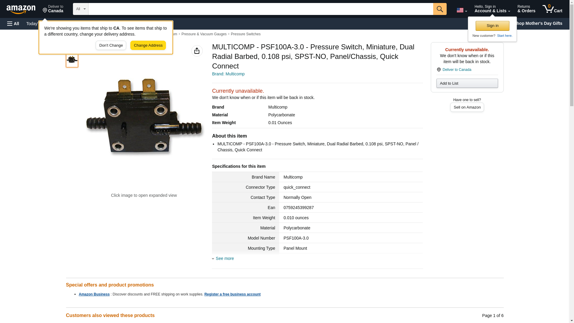 Multicomp Pro Pressure Switch, Spst-No, 0.108Psi - PSF100A-3.0