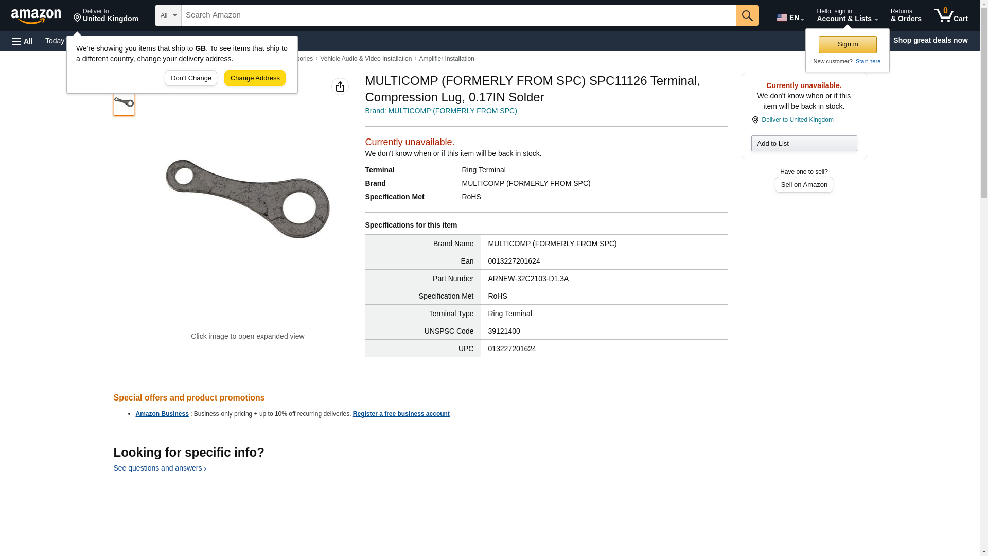 | Feature | MULTICOMP (FORMERLY FROM SPC) SPC11126 TERMINAL, COMPRESSION LUG, 0.17IN SOLDER |