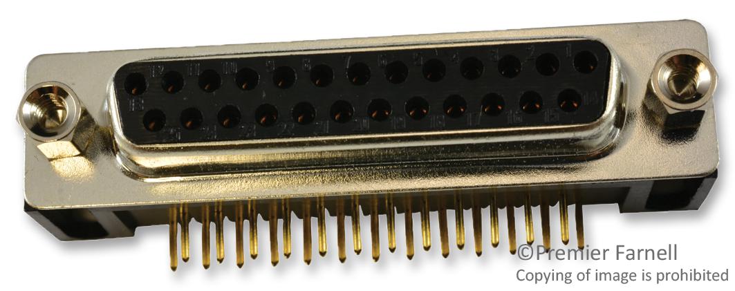 D SUB CONNECTOR, STANDARD, 25 POSITION, RECEPTACLE; No. of Contacts:25Contacts; Gender:Receptacle; Contact Termination Type:Solder; D Sub Shell Size:DB; Product Range:90deg PCB D Subs; Connector Body Material:Metal Body RoHS Compliant: Yes