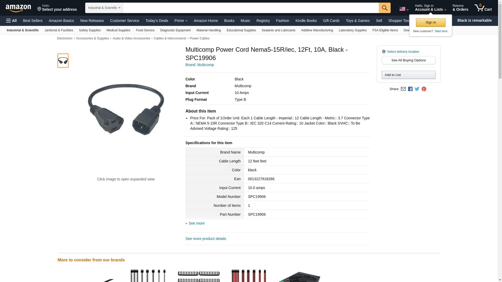 MULTICOMP - SPC19906 - POWER CORD NEMA5-15R/IEC; 12FT; 10A; BLK