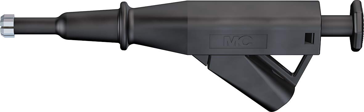 For fast, safe connection to screws/bolts with internal hexagon. Twisting the button on the back of the handle spreads the hexagonal tip so that the adapter fits firmly into internal hexagons with 5 mm wrench size. This results in multiple contact points that enable low contact resistance. The adapter can also be operated by hand when under load. The fixed ? 4 mm socket in insulator is suitable for fitting spring-loaded ? 4 mm plugs with rigid insulating sleeve. Design: 6 mm with gray button.