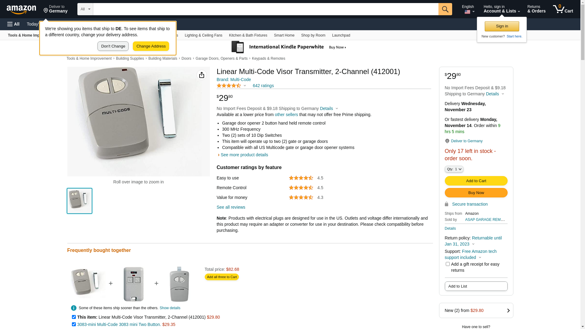 Multi-Code 412001 Two-Button Remote Control with Visor Clip 300Mhz
