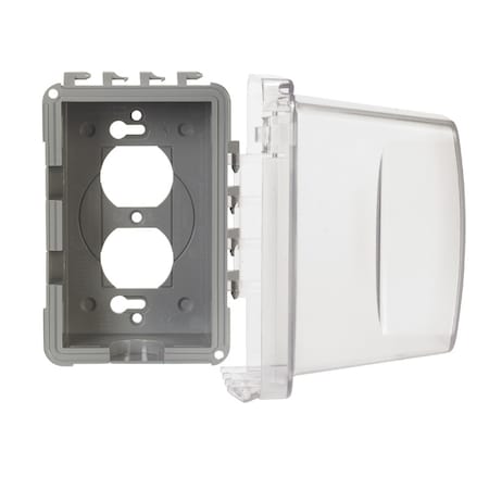 1-Gang, Vertical Mount, Weatherproof, Non-Metallic, In-Use Cover, Depth: 4-3/4". Includes Separate Insert Types: Duplex, Decora/GFCI Receptacle, Toggle Switch and Single Receptacle Diameters: 1.125", 1.375", 1.56", 1.625", 1.687" & 2.125", Color: Clear. Includes: Lockable Tab.