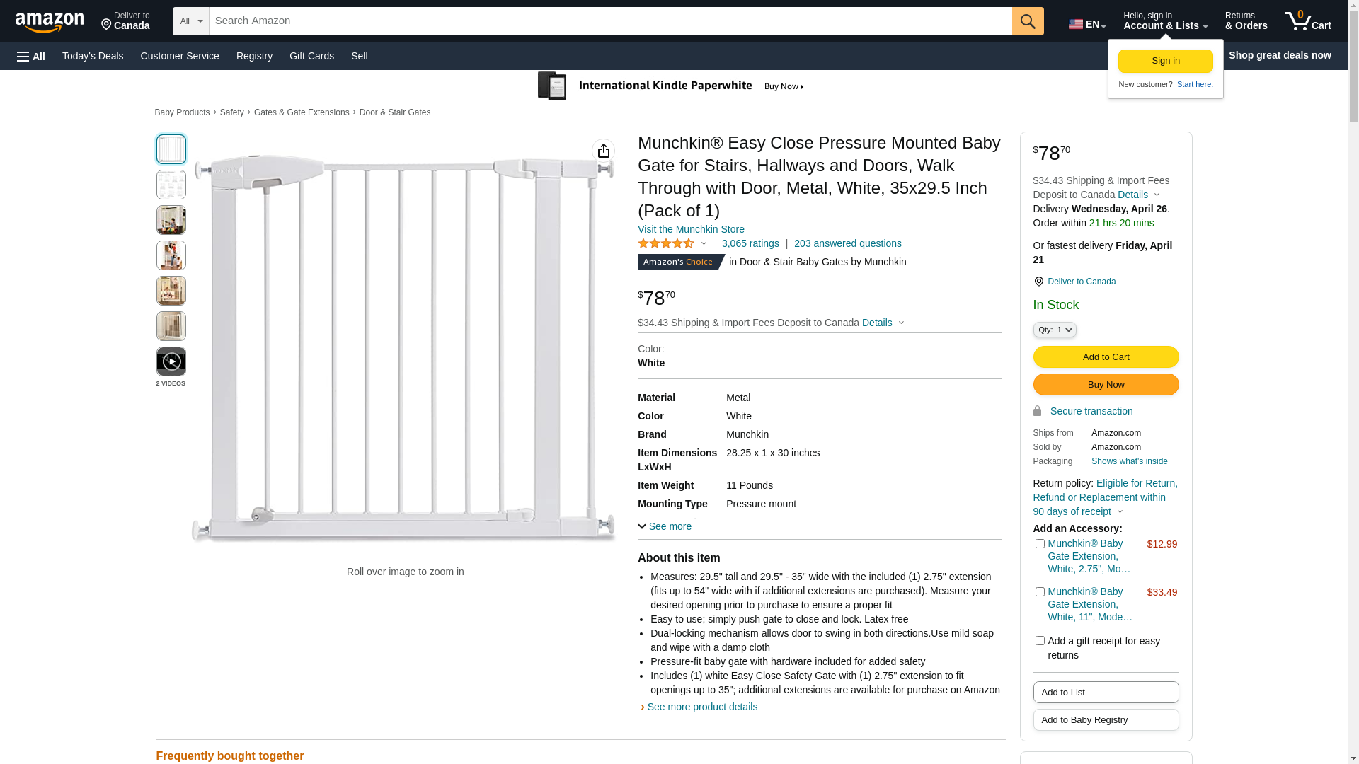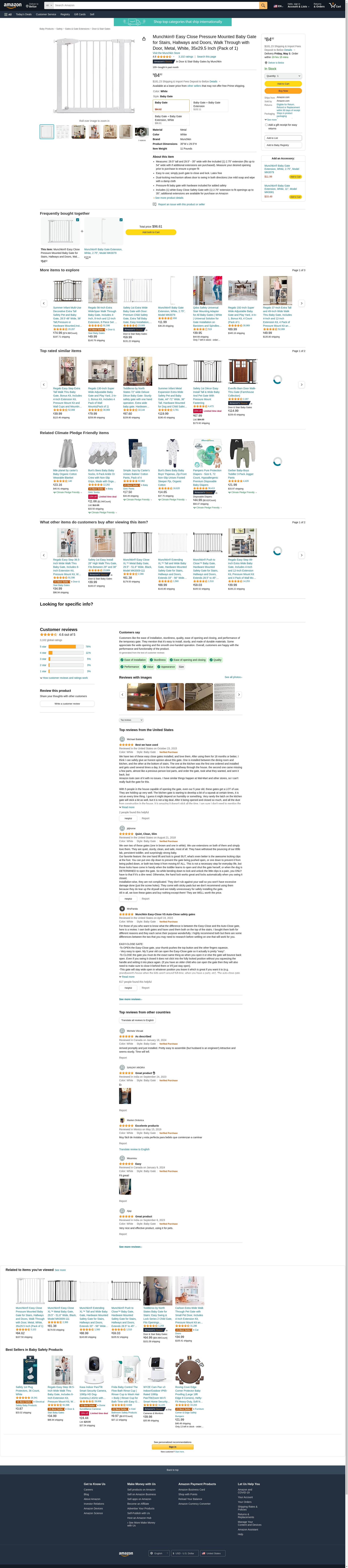 - Includes (1) white Easy Close Safety Gate with (1) 2.75" extension to fit openings up to 35"; additional extensions are available for purchase on Amazon