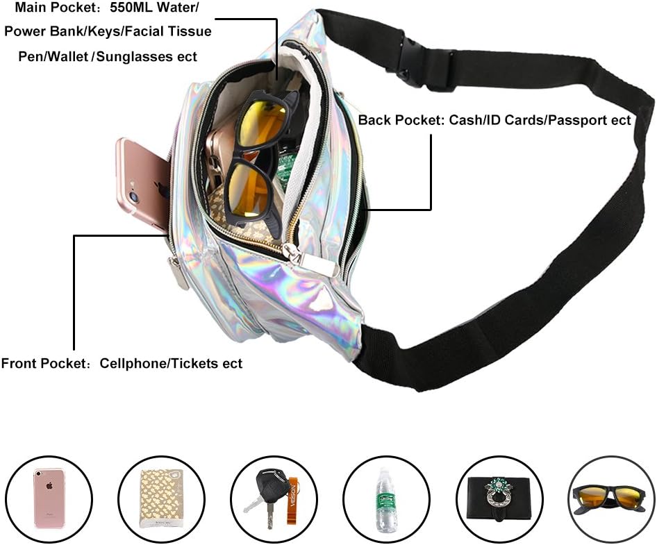 - 【ROOMY SPACE & KEEP ORGANIZED】 Metallic hologram fanny packs feature 3 pockets - 1 main front compartment is large enough for wallet, keys, passport, sunglasses, cosmetics etc;1 front compartment can easily store your phones or other small things; 1 small back compartment for keeping your ID cards and money safe. You can keep your essentials separated & organized.