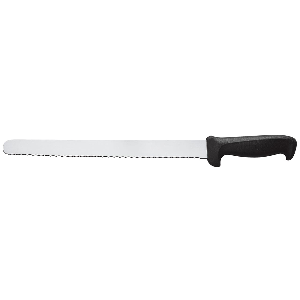 Mundial 5600 series slicing knife 8 in. High carbon stainless steel serrated edge blade, used for slicing meats; the polypropylene handle is ergonomically designed to provide a secure non-slip grip. Handle is offered in black and white. Lifetime limited warranty.