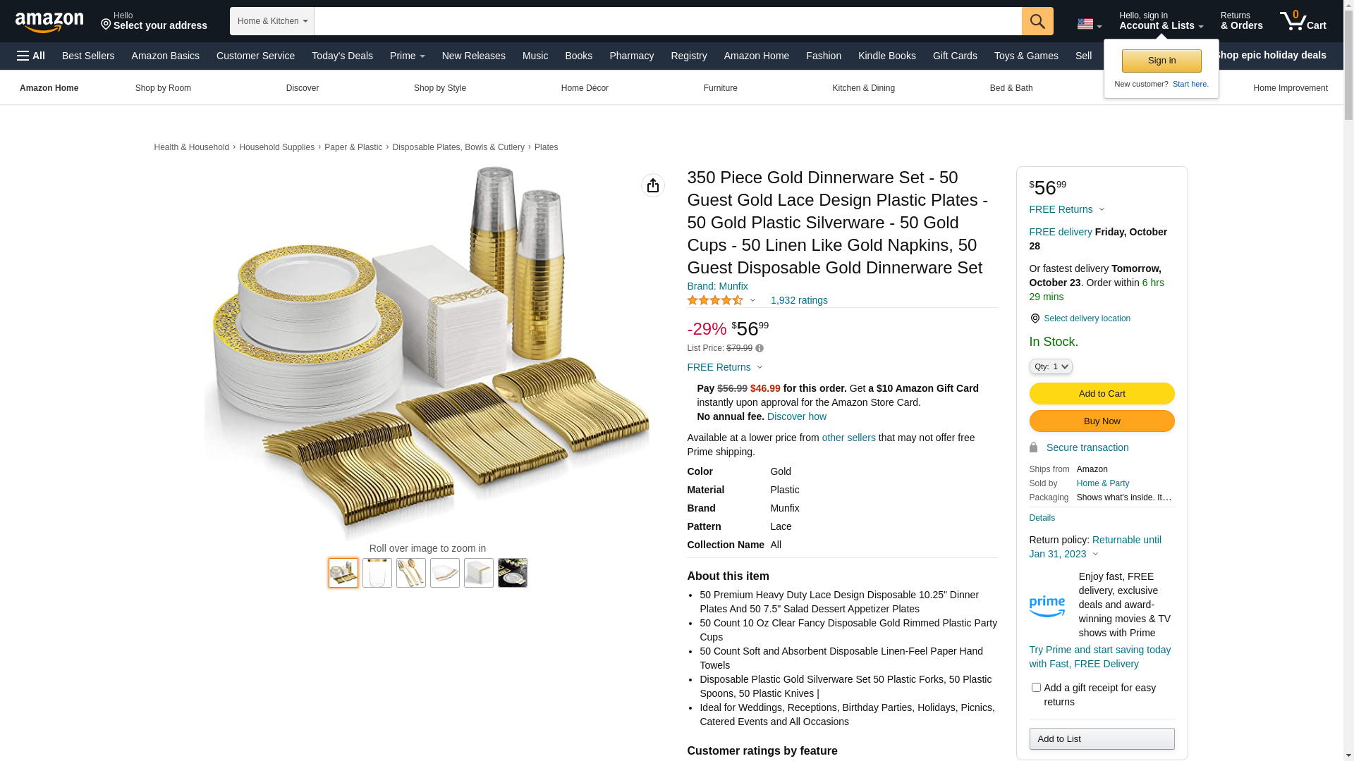 <p>Premium quality disposable dinnerware set made to save your time and energy, Just toss the dinnerware when you’re done no clean-up necessary, This set contains everything you need to serve 50 guests.<br> <p>Ideal for weddings, receptions, birthday parties, holidays, picnics, catered events and all occasions Made of durable high quality 100% food grade BPA free non-toxic heavy duty plastic Bulk pack of 100 hard plastic plates to accommodate all your guests.<br> <p><br><b>350 Piece set Includes:</b><br><br> 50 Pc 10.25" Gold Lace Rim Dinner Plates<br> 50 Pc 7.5" Gold Lace Rim Salad Plates<br> 50 10 oz Gold Rim Plastic cups<br> 50 Gold Print Napkins<br> 50 Gold Plastic Spoons<br> 50 Gold Plastic Forks<br> 50 Gold Plastic Knives<br>