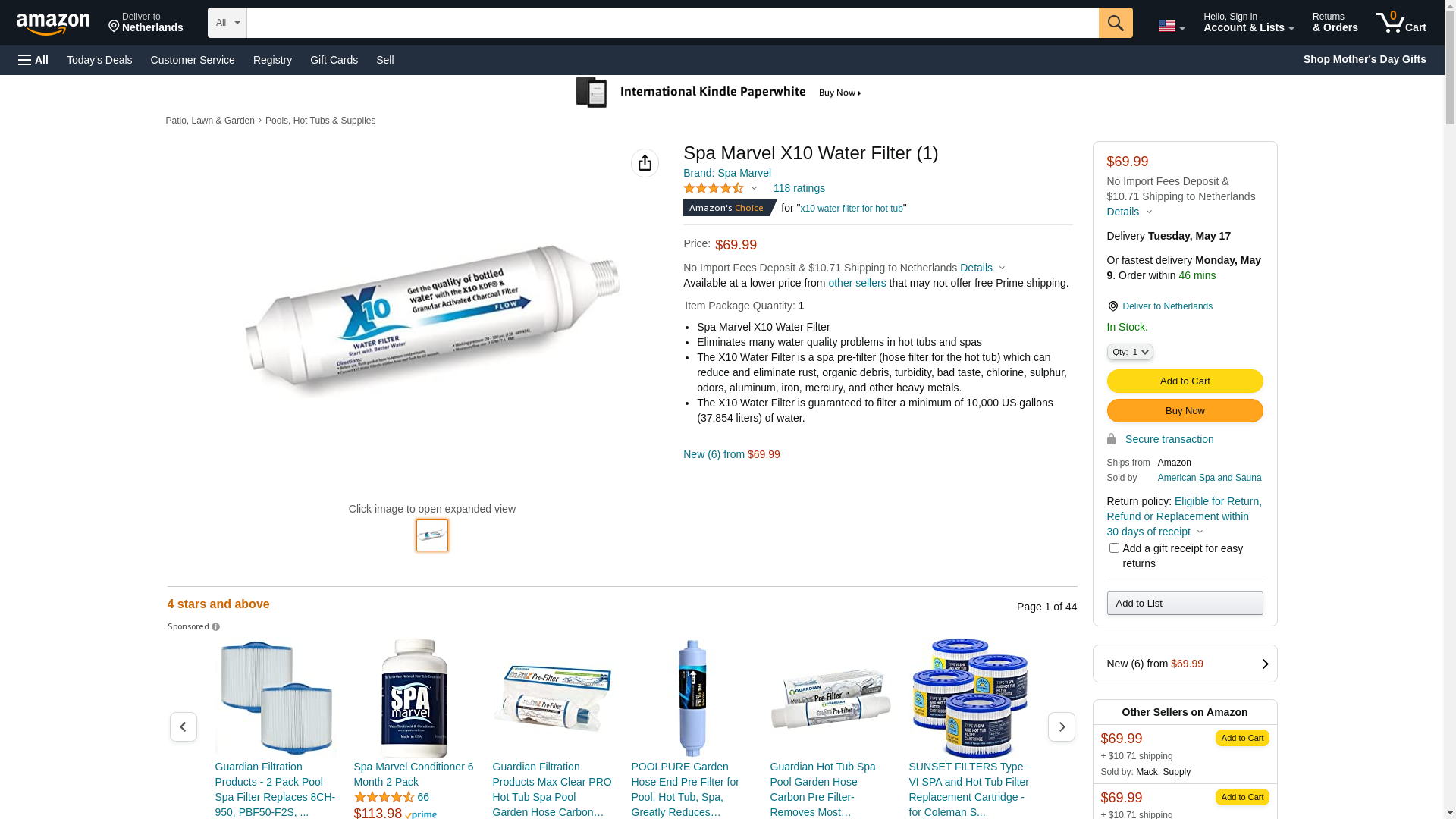 The X10 Water Filter will eliminate many water quality problems in a hot tub. The tap water, well water, and lake water used to fill a hot tub is probably not as pure as you think. Impurities such as copper, calcium, sodium, iron, mercury, and other heavy metals can be harmful to bathers, can harm your spa parts and make it harder to balance your hot tub water. These deposits can seriously harm your heater element, jets, pump and spa shell. These deposits will also make it difficult to balance your spa water and can impair water quality. The X10 Water Filter is a spa pre-filter (hose filter for the hot tub) which can reduce and eliminate rust, organic debris, turbidity, bad taste, chlorine, sulphur, odors, aluminum, iron, mercury, and other heavy metals. Hot tub chemicals such as clarifiers, coagulants, flocculants and stain and scale chemicals will reduce these impurities, but will not eliminate them. A spa pre-filter such as The X10 Filter will drastically reduce (or eliminate) the need for these chemicals, making your spa experience healthier and more enjoyable. We highly recommend the X10 Water Filter for those wanting to reduce the amount of chemicals used in hot tub water maintenance. It is especially beneficial to use filtered water if you are using a bromine or chlorine salt water generator. Bromine and chlorine generators will not work properly if your spa water contains too many impurities. Instructions: Attach the spa pre-filter to your garden hose and run the water through the filter for 30 seconds before filling your spa. Replace when the spa pre-filter is full and flow becomes restricted. The X10 Water Filter is guaranteed to filter a minimum of 10,000 US gallons (37,854 liters) of water.