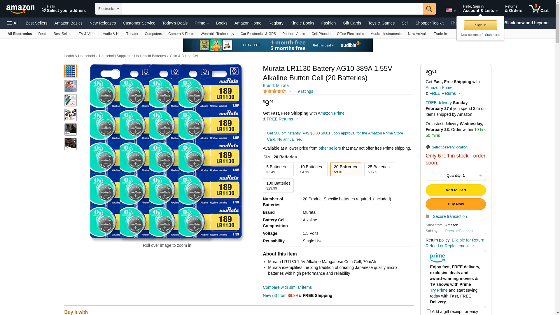 | BatteryJunction.com | MURATA-LR1130 | 1 | 1 | 1 @ $0.45 |