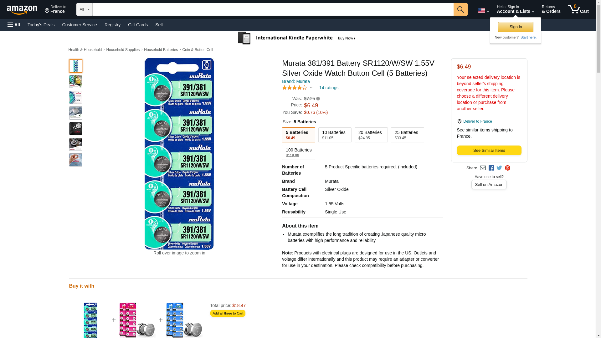 - Murata 381/391 SR1120/W/SW 1.55V Silver Oxide Button Cell Watch Battery, 60mAh