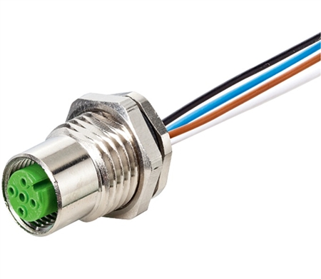 MURR 7000-13565-9720020 M12 female receptacle has a 5 pin insert with a 0.2 meter lead length and an M16 mounting thread. 125 V AC/DC, 4 Amp